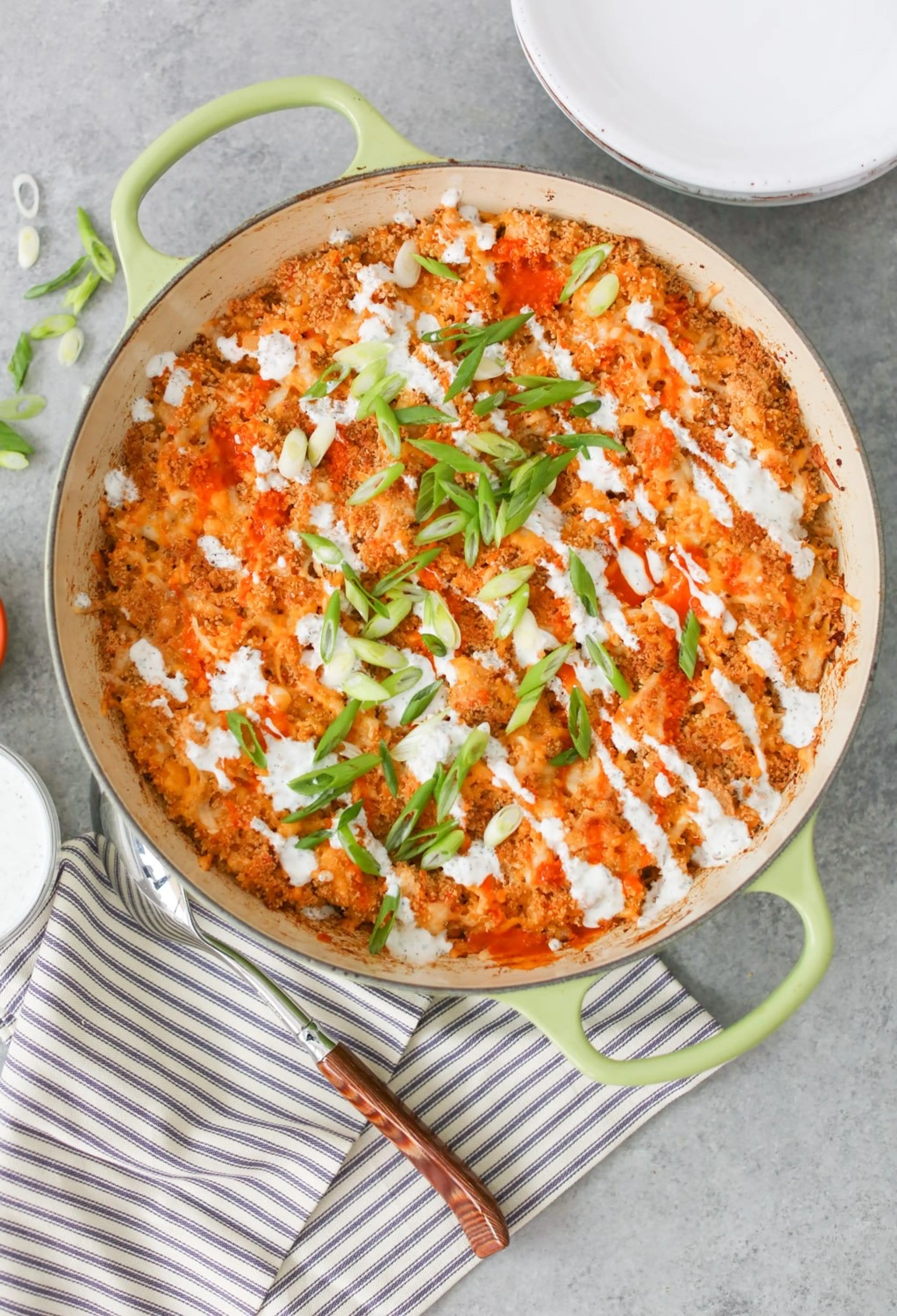 Whisk a tablespoon or so of water into the remaining yogurt ranch just until it has a drizzle-able consistency. Serve the quinoa bake drizzled with as much extra ranch and Frank’s as you like and garnish with scallions.