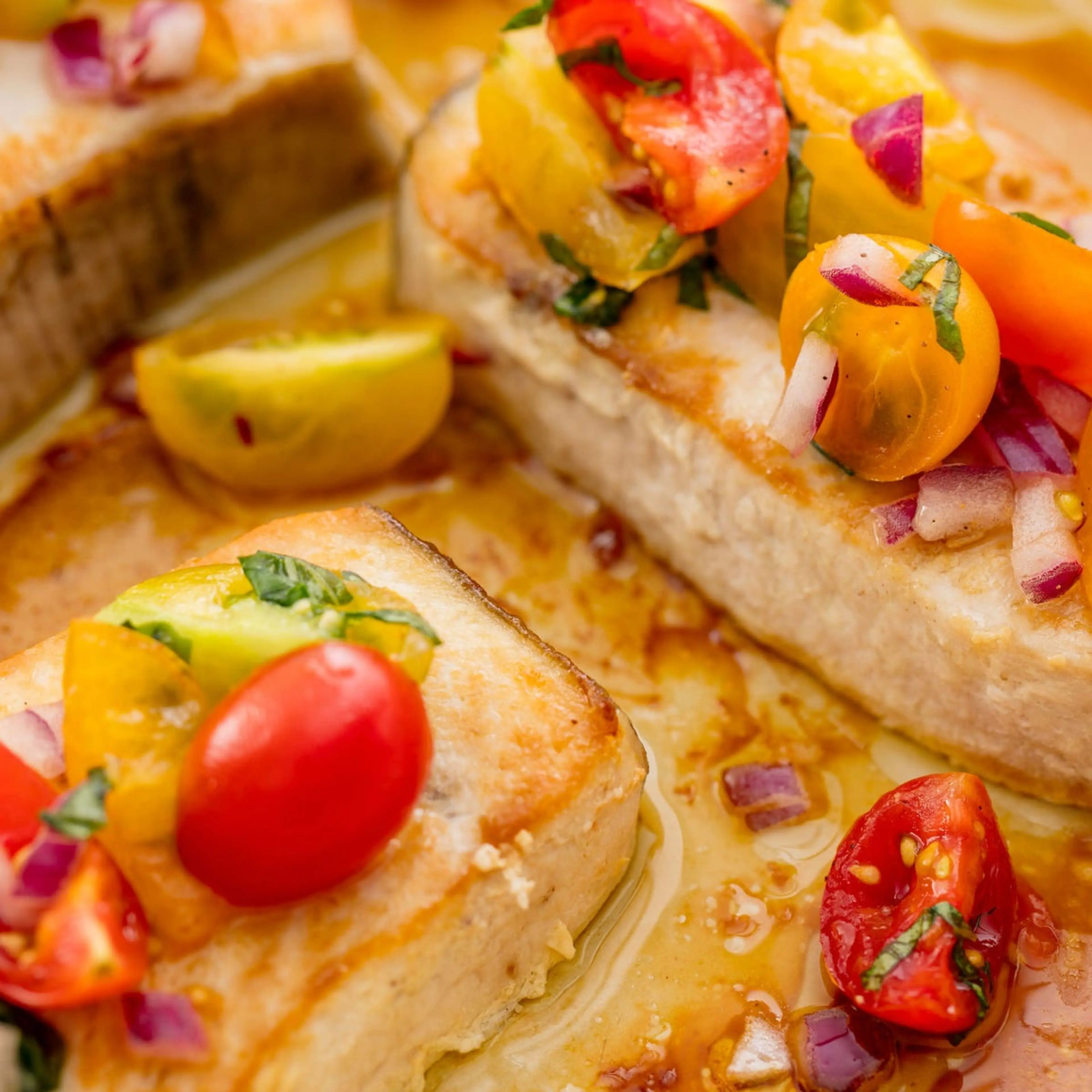 Spoon salad over fish and serve.