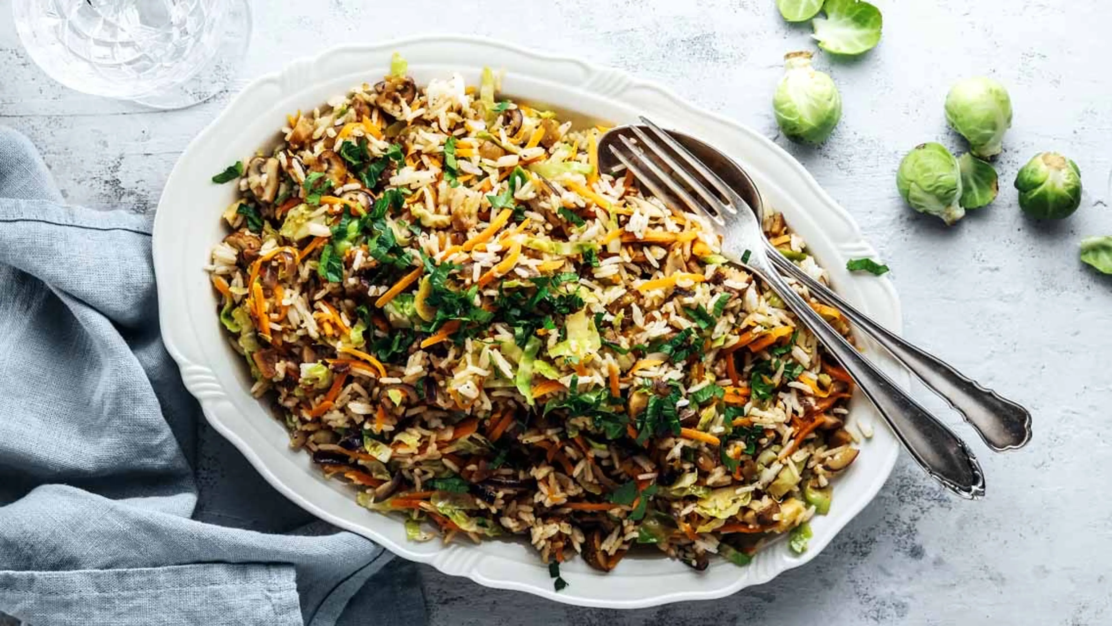 Gebratener Reis mit Rosenkohl, Pilzen & Maronen
