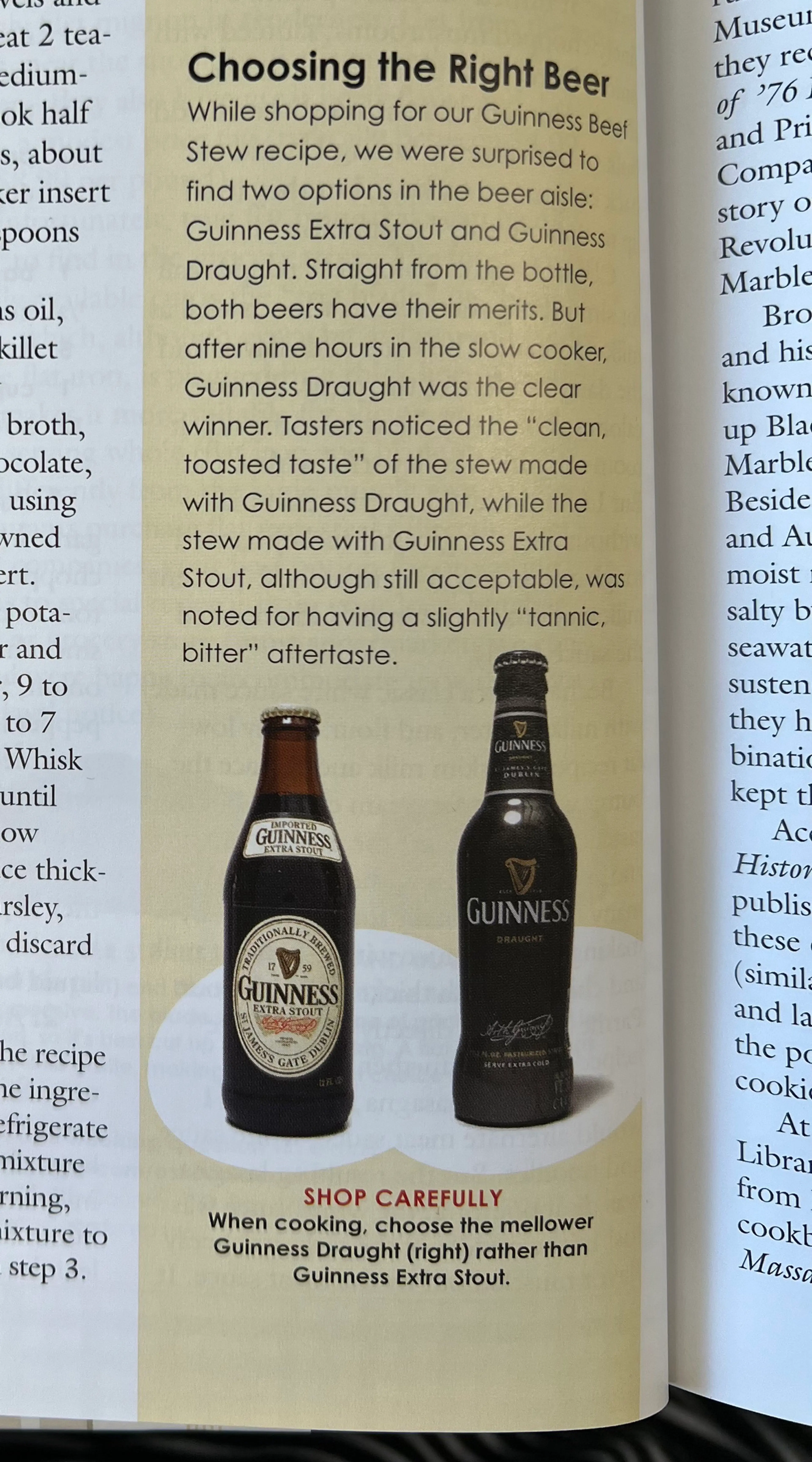 Choosing the Right Beer While shopping for our Guinness Beef Stew recipe, we were surprised to find two options in the beer aisle: Guinness Extra Stout and Guinness Draught. Straight from the bottle, both beers have their merits. But after nine hours in the slow cooker, Guinness Draught was the clear winner. Tasters noticed the "clean, toasted taste" of the stew made with Guinness Draught, while the stew made with Guinness Extra Stout, although still acceptable, was noted for having a slightly "tannic, bitter" aftertaste.