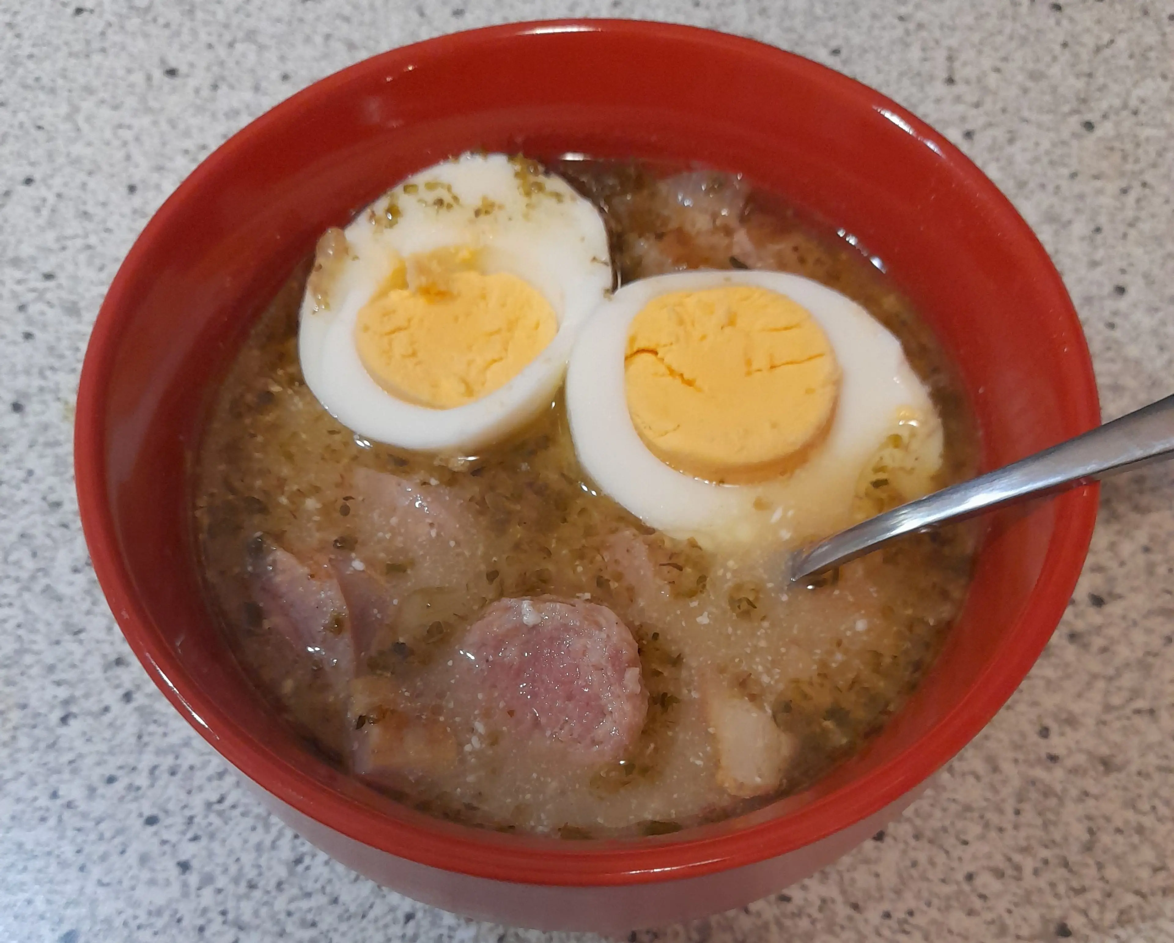 Adding cream is optional, but it balances the flavours very nicely. Place 3 tablespoons of whipping cream into a cup or a small bowl. Add in a tablespoon of Żurek, mix well with a fork. And another spoonful of soup and mix again. Repeat with 2 more tablespoons of Żurek. Pour the mixture into the pot.